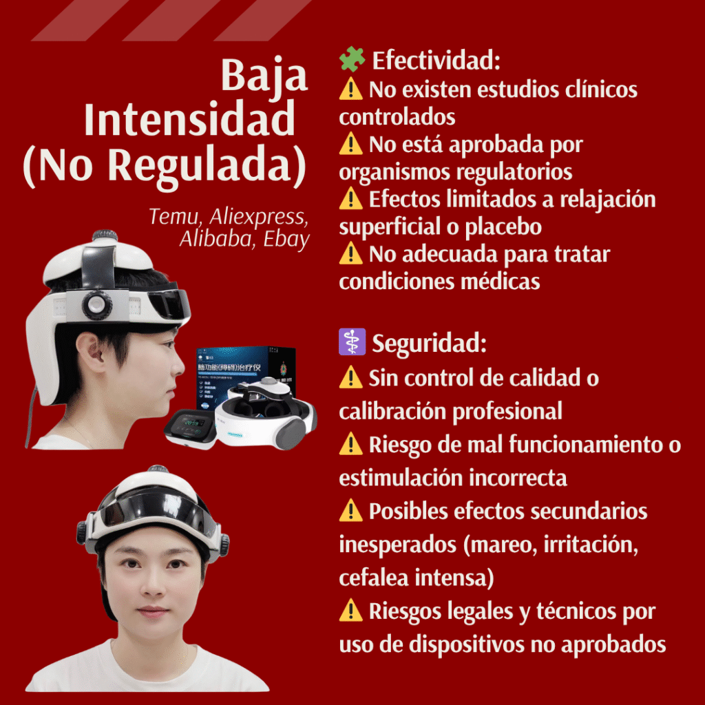 En otras palabras, los equipos de baja potencia no son TMS clínico, y su uso puede ser inefectivo o incluso riesgoso si se aplican sin evaluación previa.